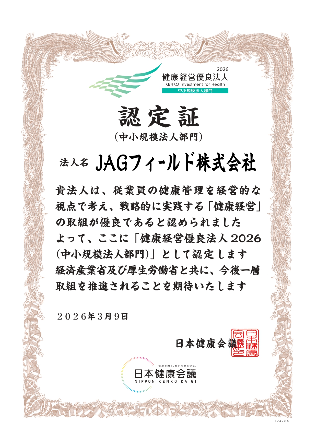 JAGフィールドは、経済産業省と日本健康会議が共同で実施する「健康経営優良法人(中小企業法人部門)」に認定されました。